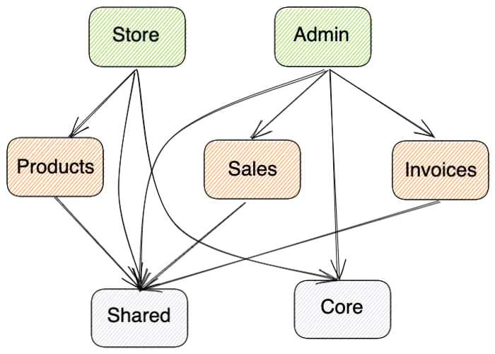 Our repository consists of two applications — Store and Admin. Each of them is composed of several feature libraries — Products (for Store), Sales, and Invoices (for Admin). Also, both of these applications depend on the Core library, and every project in our repo depends on our Shared library. Using common sense, we would like to enforce certain boundaries: